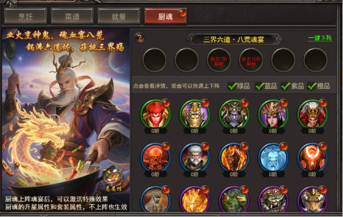 b. 厨魂上阵后,可以激活特殊效果,升星和套装属性,不上阵也生效;