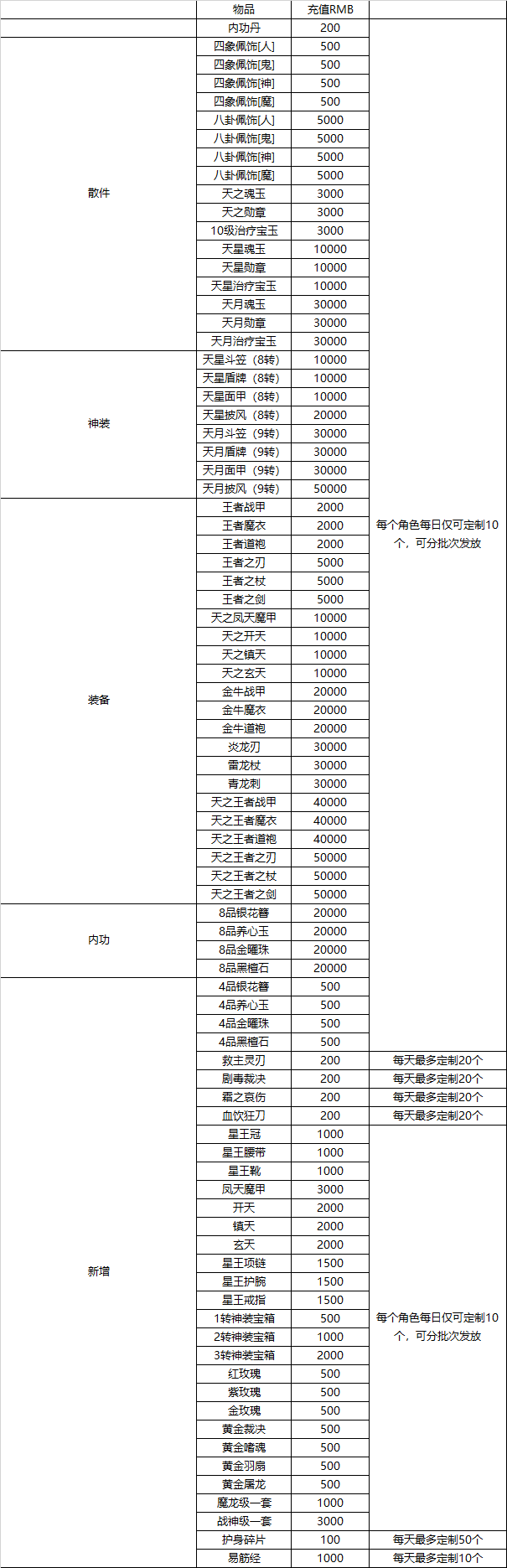 【活动说明】此活动每日均可参与1次,可根据当日实际充值金额来兑换相应物品。可拆分兑换,例如充值1000元,可兑换一个500物品+2个200物品+1个100物品